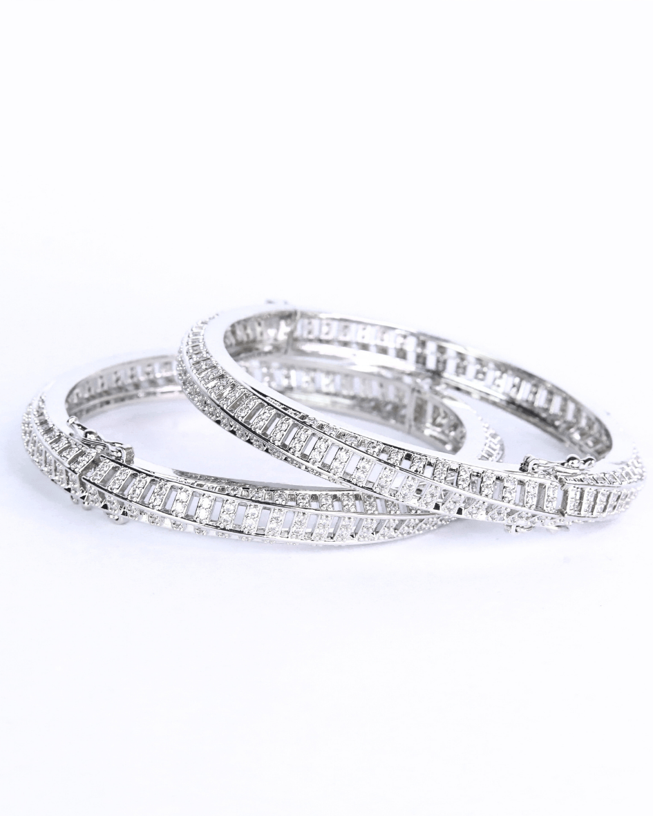 These zircon diamond bangles are a symphony of light and luxury, each one meticulously crafted to capture and reflect brilliance from every angle. Rows of baguette-cut diamonds encircle the form, their clean lines and precise faceting creating a dazzling display of fire and ice. Tiny pavé-set diamonds add a delicate shimmer, enhancing the overall radiance and creating a captivating play of light. The precious metal, likely white gold or platinum, provides a cool, elegant backdrop, allowing the diamonds to take center stage. These bangles are more than just jewelry; they are wearable works of art, exuding sophistication and timeless beauty.