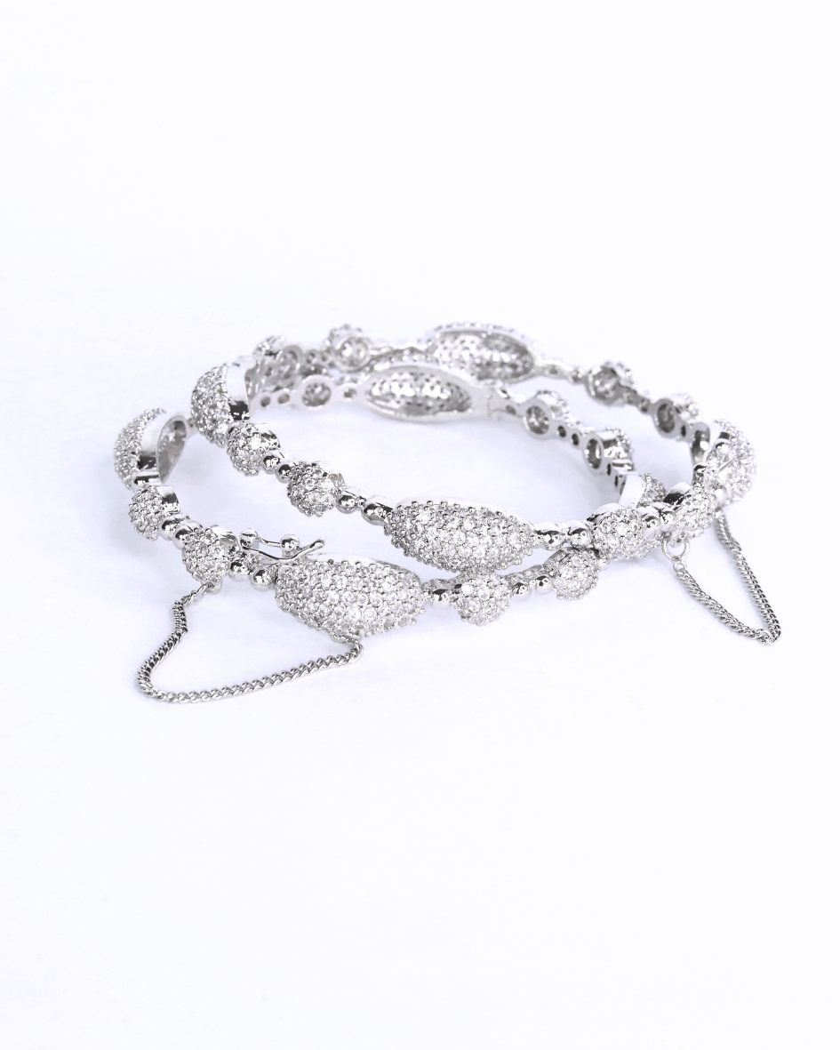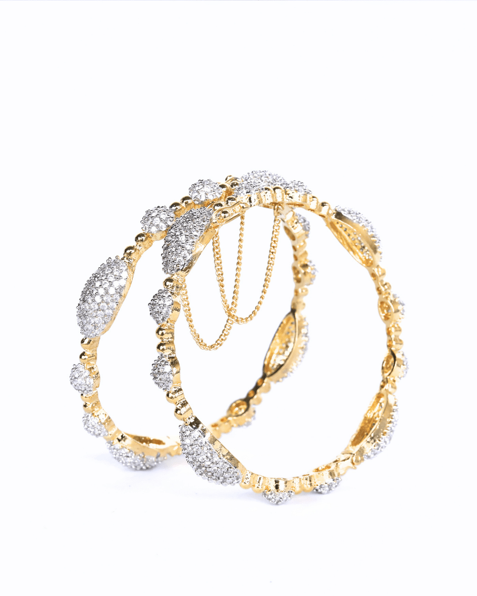 These gold-toned bangles feature an intricate design, adorned with sparkling stones that catch the light with every movement. Delicate chains dangle gracefully, adding a touch of playful elegance to the set. These bangles are perfect for adding a luxurious and sophisticated touch to any ensemble, suitable for both special occasions and elevating everyday style.
