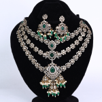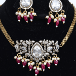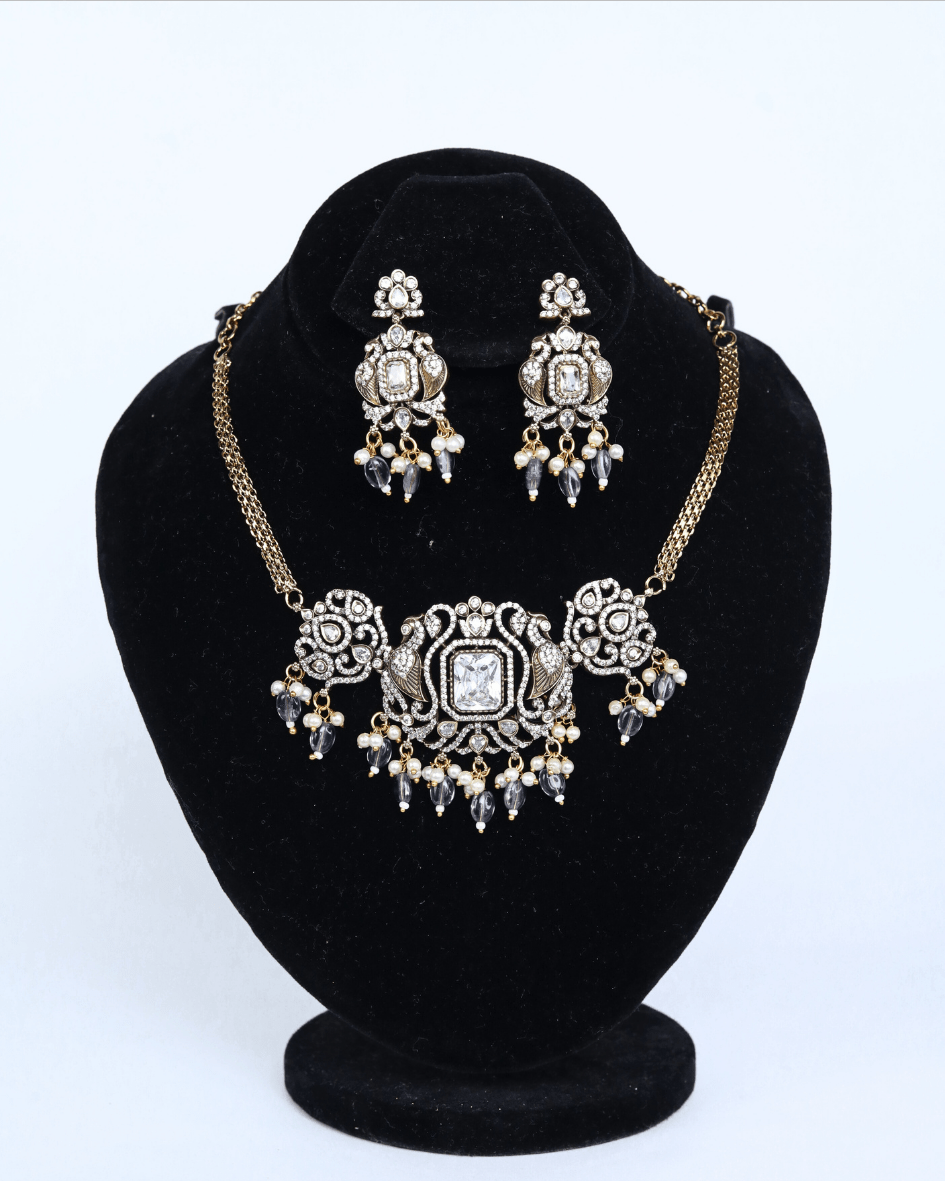 This exquisite jewelry set features a dual-tone necklace and matching earrings, showcasing a blend of classic and contemporary design elements. The necklace’s centerpiece is an intricately designed pendant, adorned with a central square-cut stone, possibly cubic zirconia, surrounded by delicate filigree work and smaller stones. The pendant is flanked by stylized peacock motifs, adding a touch of traditional elegance. Dangling from the pendant and earrings are clusters of small, lustrous pearls and gray beads, providing a subtle contrast and movement. The necklace chain is a fine, dual-tone metal, complementing the overall aesthetic. The earrings mirror the pendant’s design, featuring similar stones, filigree, and beadwork, creating a harmonious and balanced set. This jewelry set would be ideal for formal occasions, adding a sophisticated and refined touch to any ensemble.
