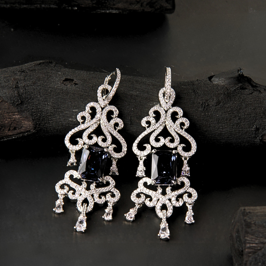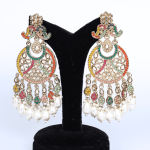 The Jhumki Kundan earrings are a captivating blend of tradition and elegance. The earrings feature a square-cut, deep purple and redish stone surrounded by a halo of sparkling crystals, which sits atop an intricately designed, bell-shaped Jhumki. The Jhumki itself is adorned with delicate crystal detailing and small pearl and ruby-colored bead drops, adding movement and a touch of color. These earrings, with their rich cultural heritage, are more than just accessories; they are a statement of grace and timeless beauty.