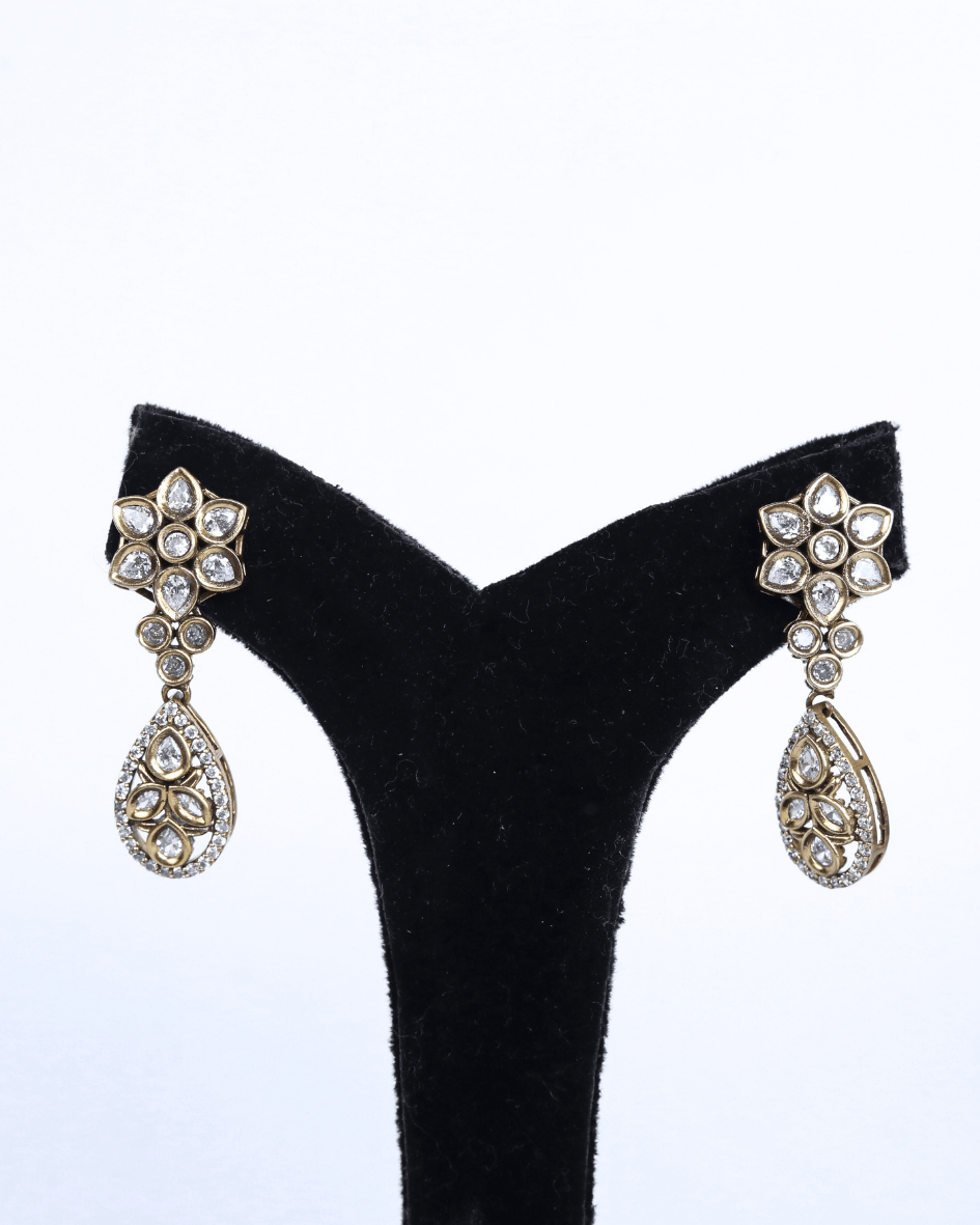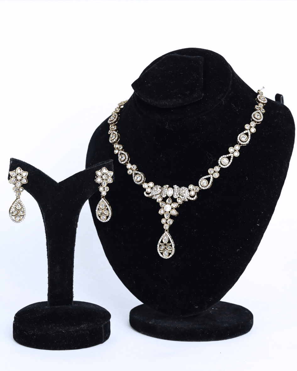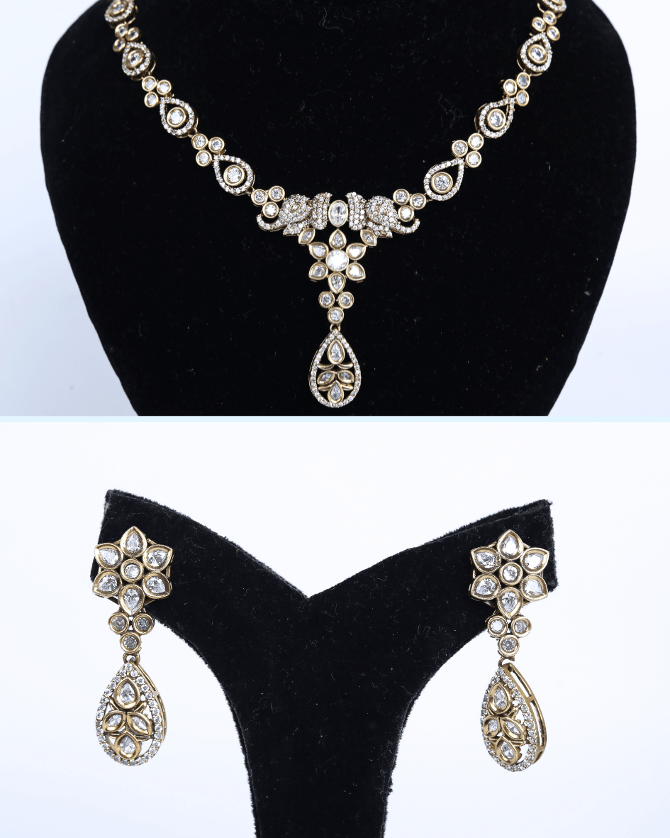This exquisite Diamond necklace set features a delicate arrangement of sparkling cubic zirconia stones, meticulously set in a lustrous, likely rhodium-plated or sterling silver base. The necklace showcases a symmetrical design with floral and teardrop motifs, culminating in a central pendant that adds a touch of graceful movement. Matching drop earrings echo the necklace’s design, creating a harmonious and elegant ensemble suitable for special occasions or adding a touch of glamour to everyday wear. The brilliance of the stones, combined with the intricate metalwork, evokes the allure of fine diamond jewelry while remaining an accessible and stylish choice.