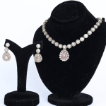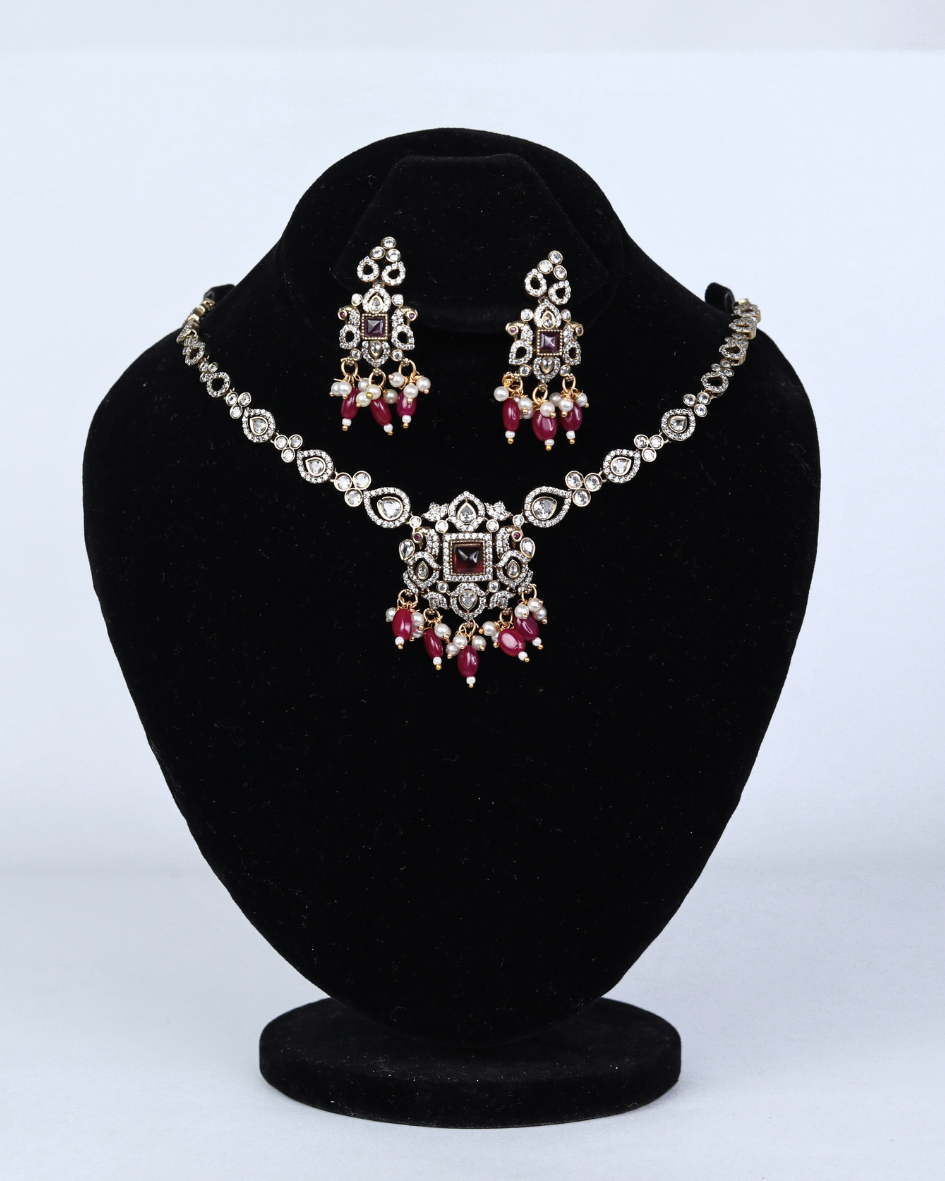 This set features a Kundan necklace and matching earrings. The necklace showcases intricate detailing with white Kundan stones and a square-shaped pendant, accented with ruby-colored drops and tiny pearls. The earrings mirror the pendant’s design, creating a cohesive and elegant look. The set exudes a traditional yet luxurious charm, perfect for special occasions.