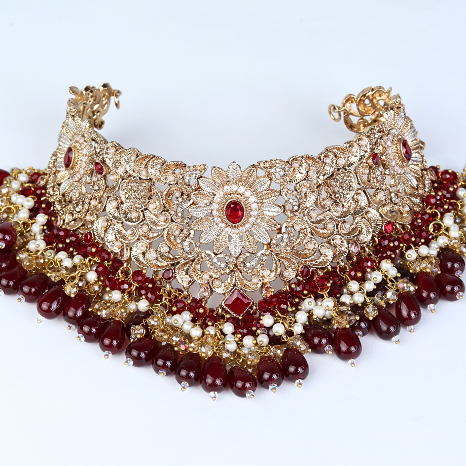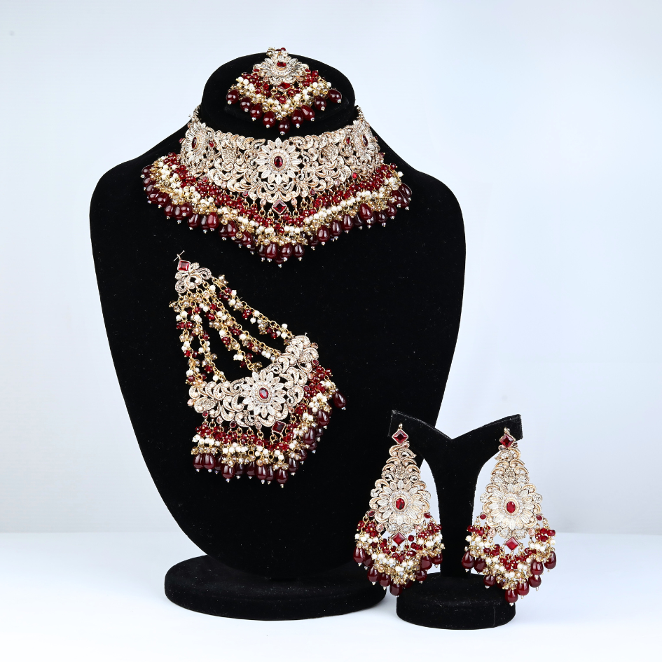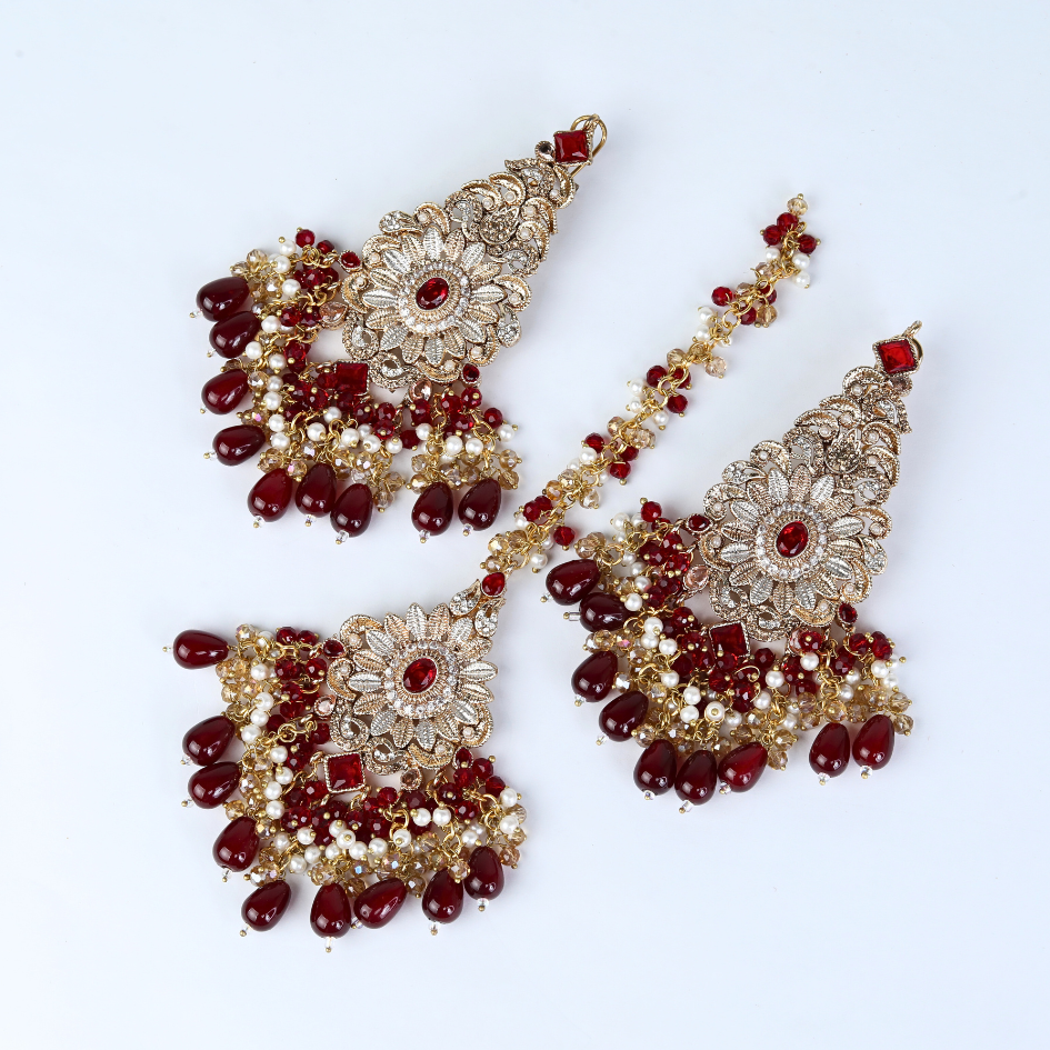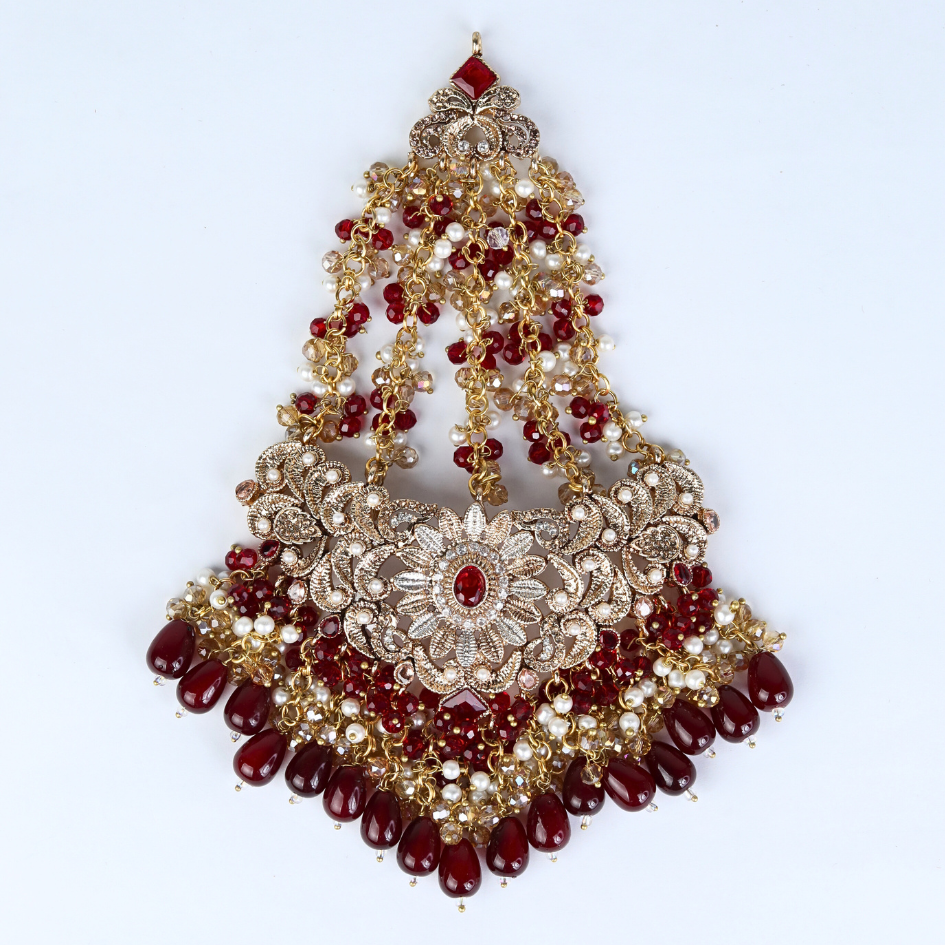 A stunning traditional jewellery set for a wedding or festives to make your occasion memorable. It includes a necklace, a headpiece (mangtika), and a pair of earrings, all featuring intricate gold-toned designs adorned with red and white beads or stones. The necklace is a choker style with a broad, ornate pattern, while the mangtika matches its design and hangs elegantly on the forehead. The earrings are large and teardrop-shaped, complementing the set with their detailed craftsmanship and dangling elements. The overall aesthetic is rich and luxurious, perfect for adding a touch of cultural elegance to any special event.