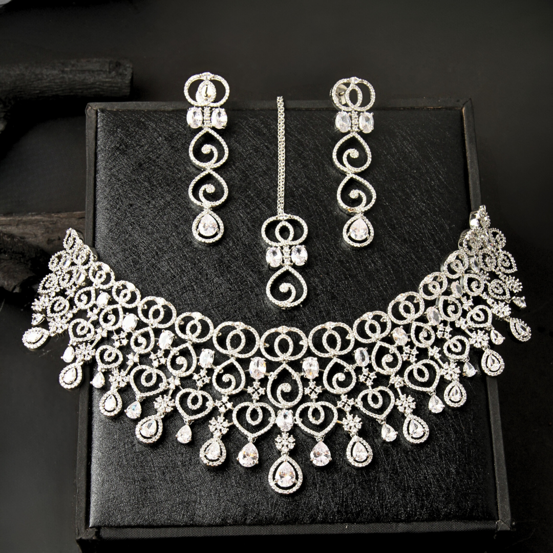 Experience the grandeur of wedding jewelry with the Bridal Opulence Set. Featuring dazzling zircon and gold-plated accents, this luxurious set is ideal for brides wanting to make a bold and elegant statement. A must-have for anyone looking for the best artificial bridal sets online.