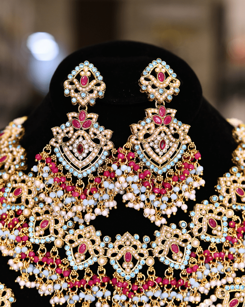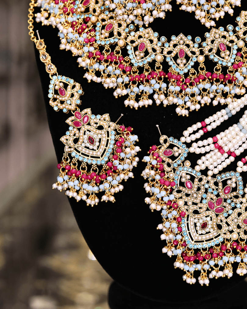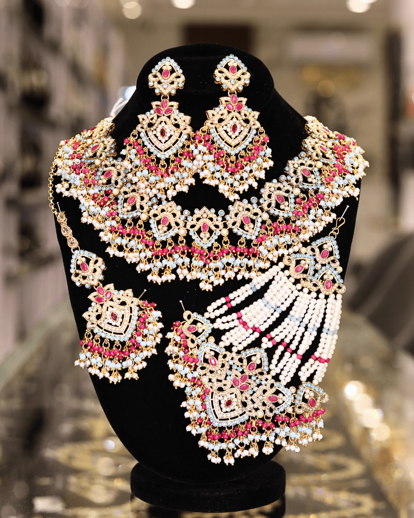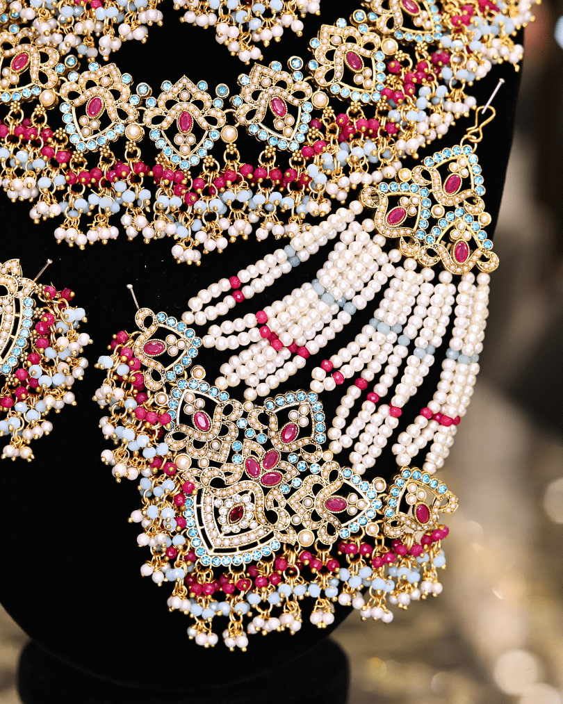 This Naurattan bridal set is an exquisite ensemble, featuring an intricate design with a harmonious blend of gold, pink, and light blue accents, complemented by delicate pearl drops. The set includes a statement necklace with a central, ornate pendant, surrounded by layers of smaller, detailed elements and pearl strings. Matching earrings, designed in a chandelier style, echoing the necklace’s patterns and colors. A tikka, with a similar design motif, intended for the forehead. An additional hair accessory for the side of the head, featuring cascading pearl strands. This bridal set is ideal for weddings, particularly within South Asian traditions, where such elaborate jewelry is customary. The combination of vibrant colors and classic design elements makes it a striking accessory for a bride.