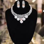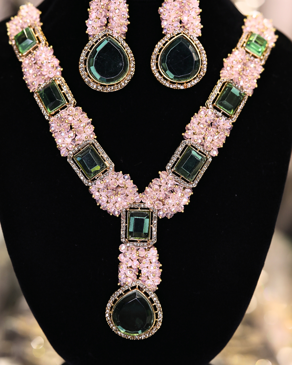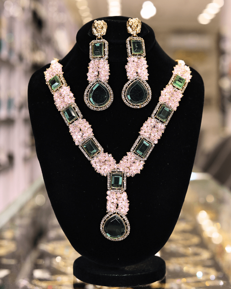 This jewelry set features a necklace and matching earrings, showcasing a blend of elegance and sophistication. The necklace is designed with a series of square and teardrop-shaped emerald-green stones, each surrounded by a halo of small, light pink stones that add a delicate contrast. The earrings mirror this design, with a smaller emerald-green teardrop stone and similar pink stone detailing, topped with an intricate gold-toned design, possibly depicting a lion’s head. The overall aesthetic suggests a luxurious and refined taste, suitable for formal occasions or as a statement piece. The jewelry is displayed on a black velvet bust, which accentuates the colors and sparkle of the stones, enhancing its visual appeal.