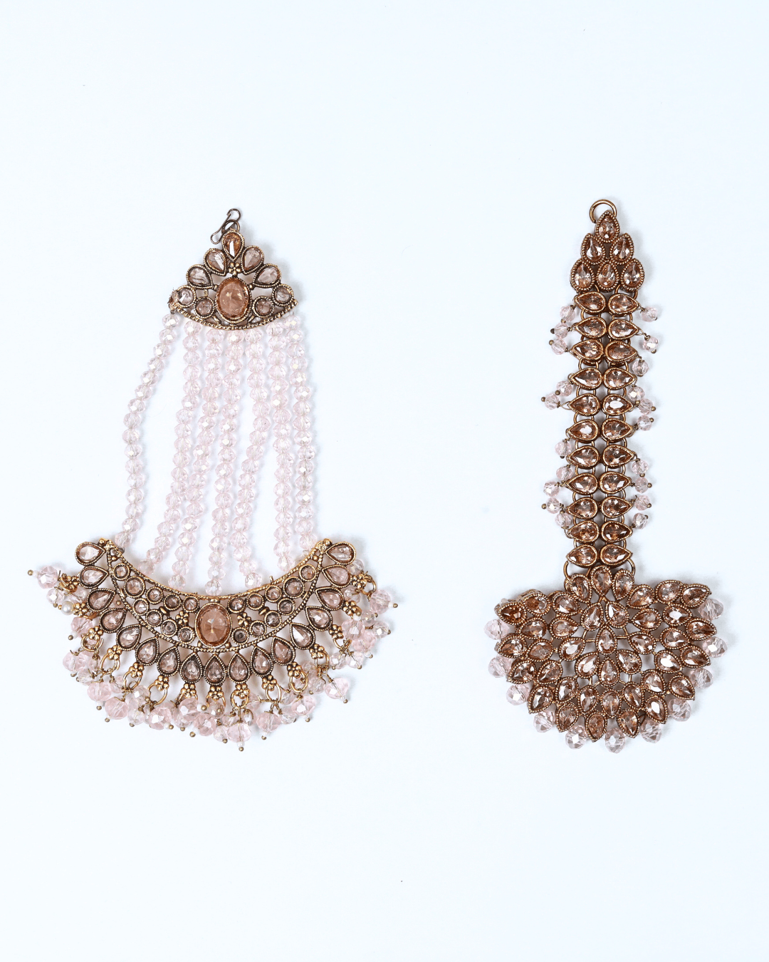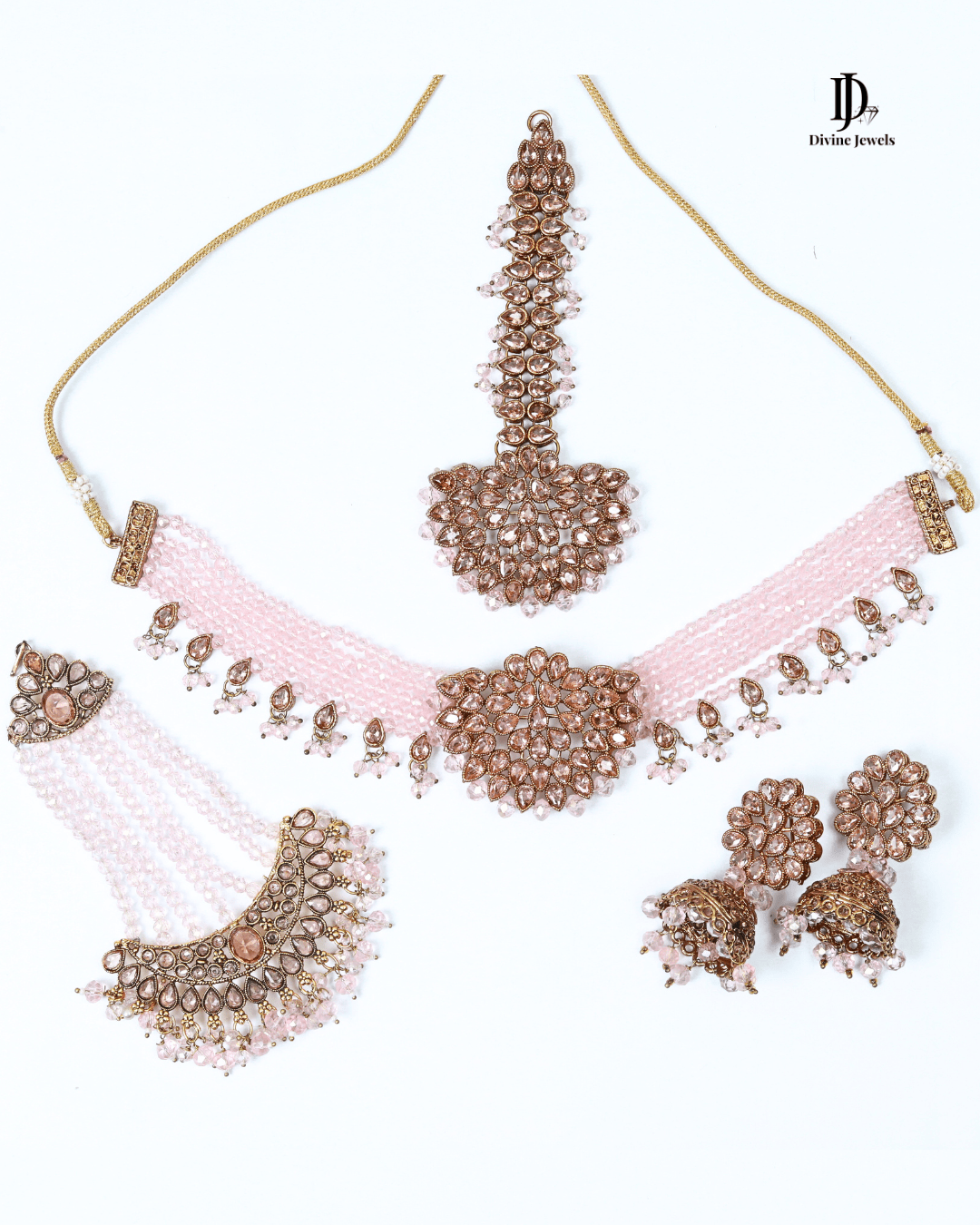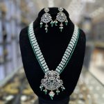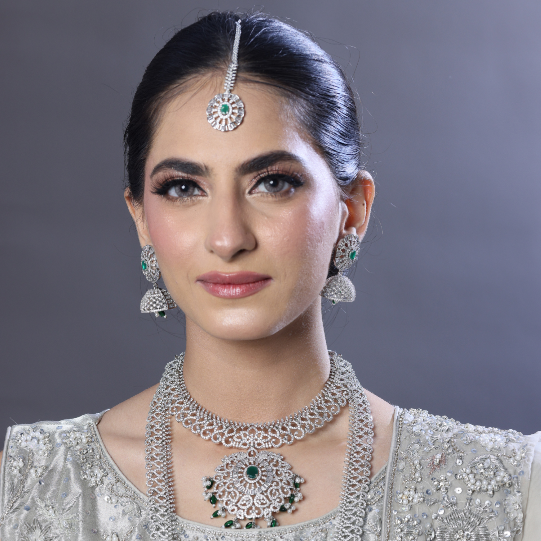 A timeless statement set crafted with intricate Kundan work, enhanced by shimmering crystal details for a refined, regal look.