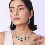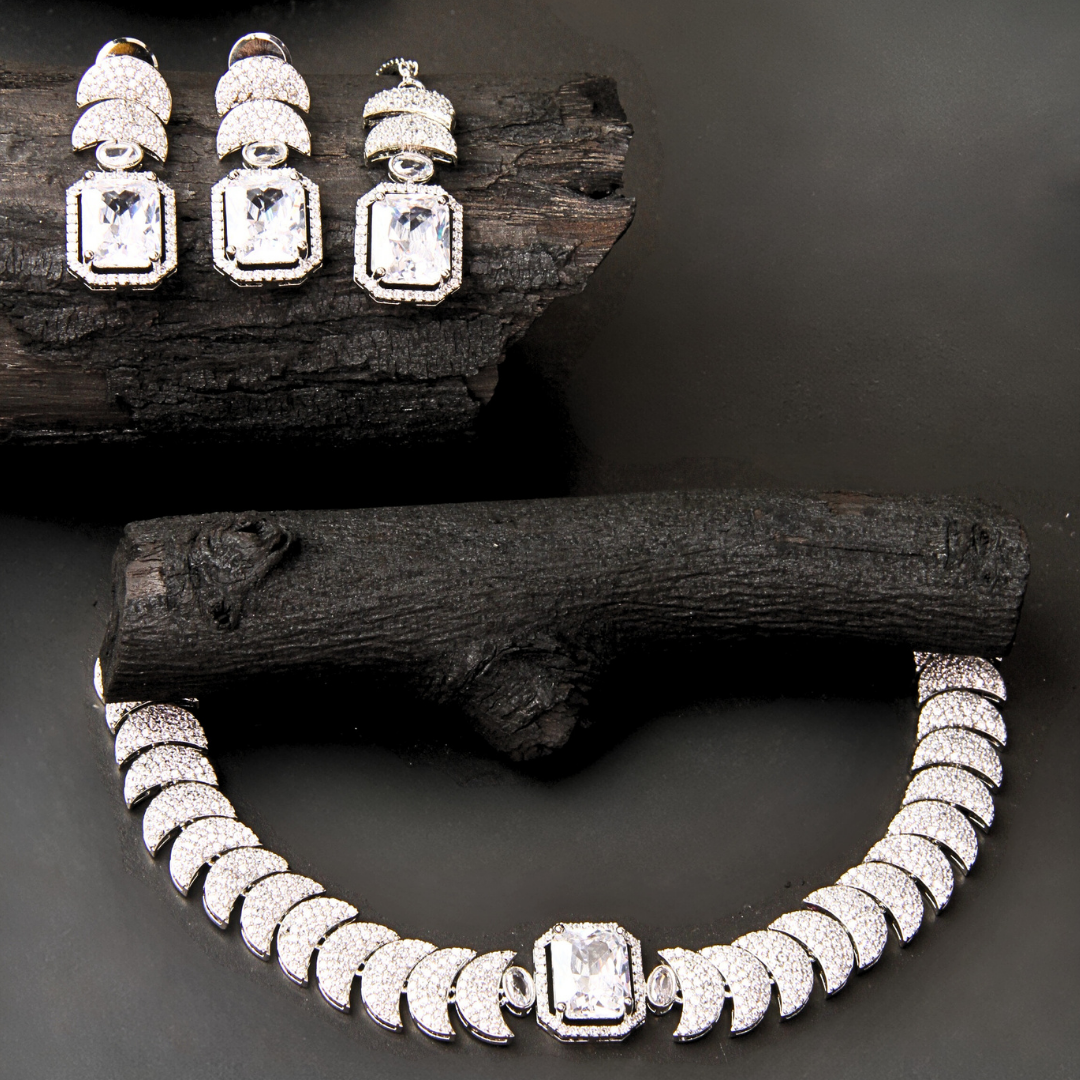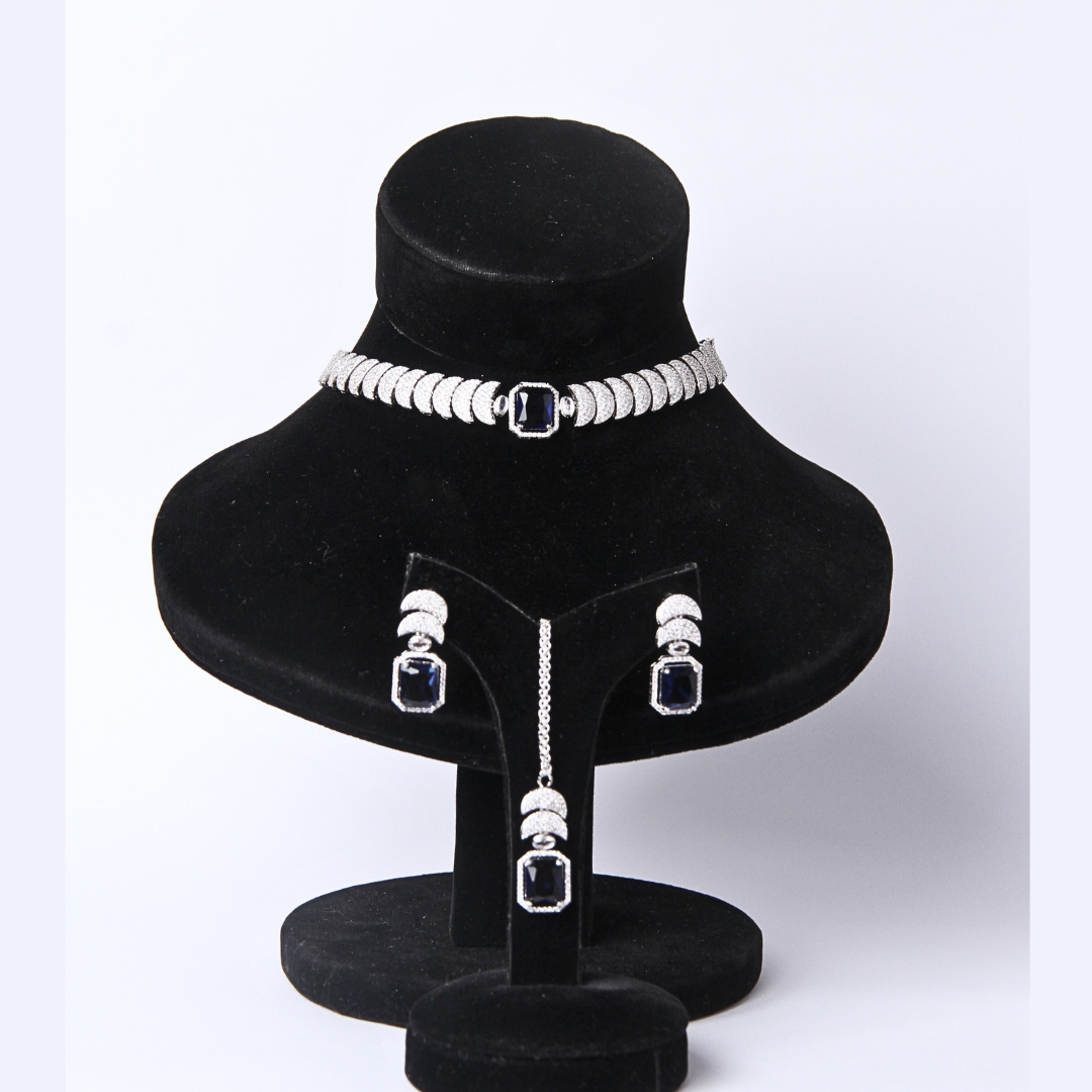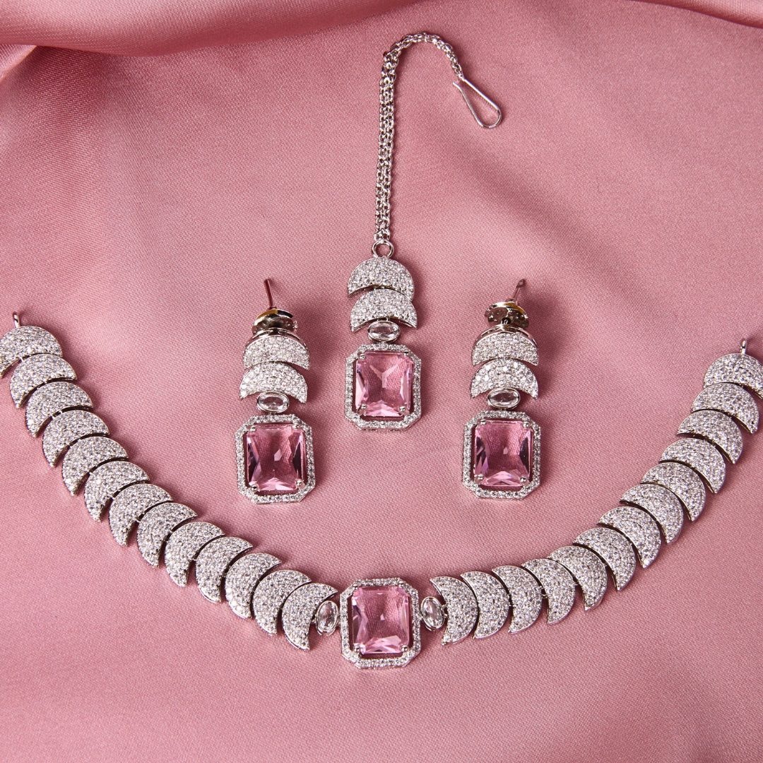 Elevate your party look with the Luxe Zircon Choker Set, a stylish design paired with matching earrings and a maang tikka. This set is the ultimate choice for women seeking high-quality jewelry that is perfect for wedding guest jewelry or formal occasions.