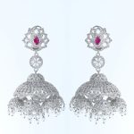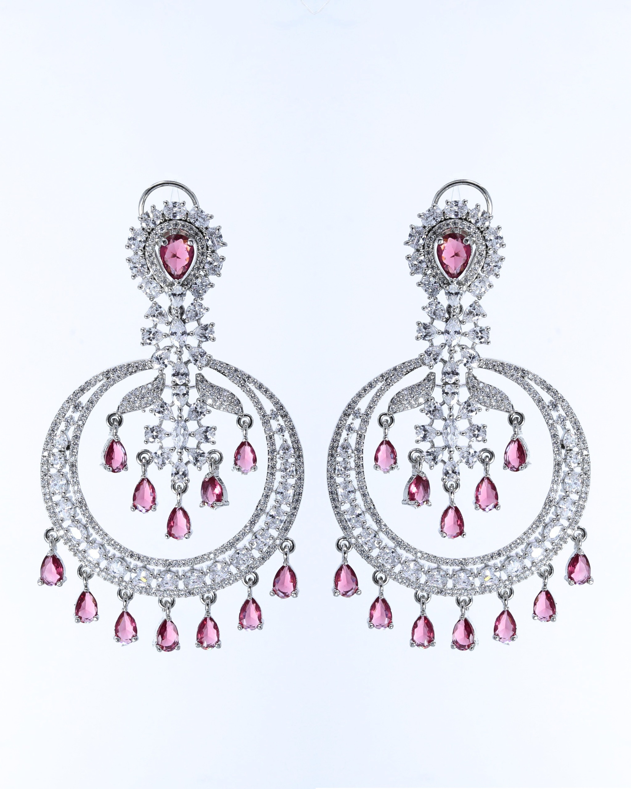 A pair of ornate, dangling earrings. Each earring features a large, circular hoop encrusted with small, clear gemstones, likely cubic zirconia or diamonds, set in a silver-toned metal. From the lower half of the hoop, several teardrop-shaped pink gemstones dangle delicately. At the top of each earring, a more elaborate design element is present, featuring a larger, heart-shaped pink gemstone surrounded by smaller clear stones, resembling a floral or sunburst pattern. The earrings appear to be designed for formal occasions, possibly bridal wear or evening events, given their intricate detailing and the use of both clear and colored gemstones. The overall aesthetic is elegant and eye-catching, blending classic and contemporary design elements.