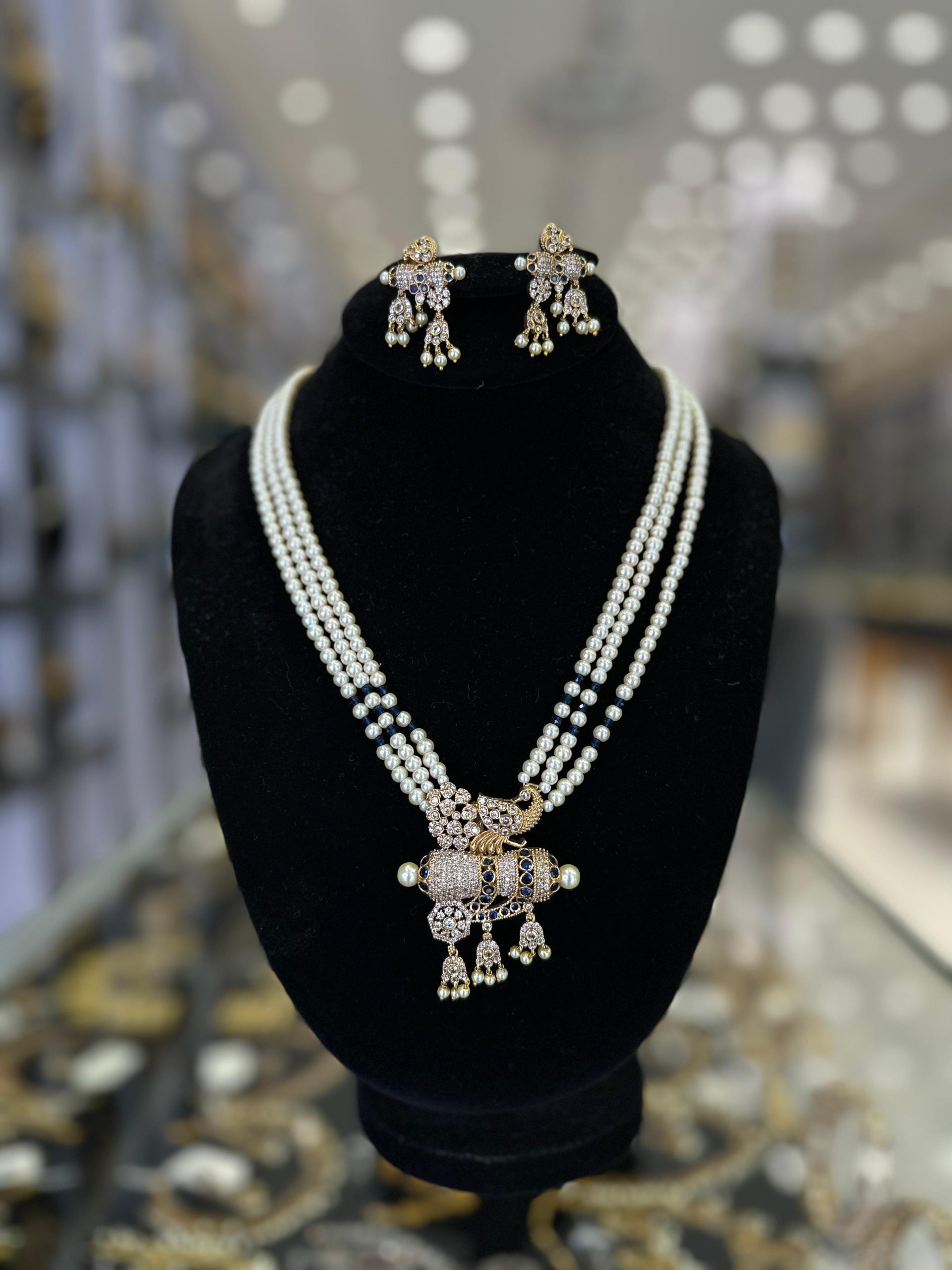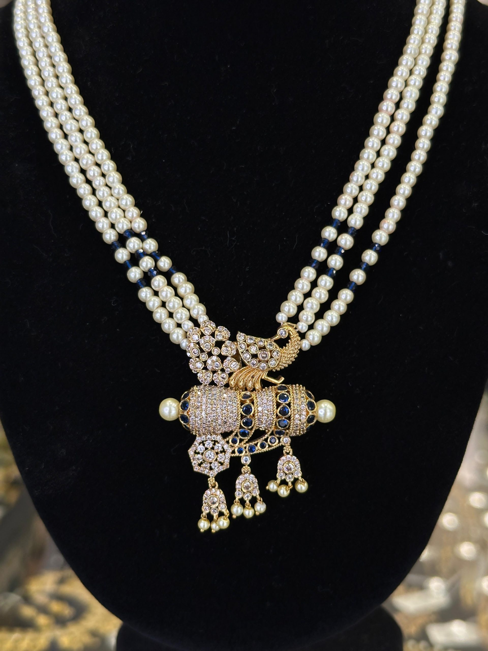 This jewellery is characterized by its multi-layered and often long design, frequently featuring multiple strands of pearls, gold, or gemstones. The necklace typically includes an ornate central pendant, often intricately designed and embellished with stones.