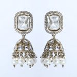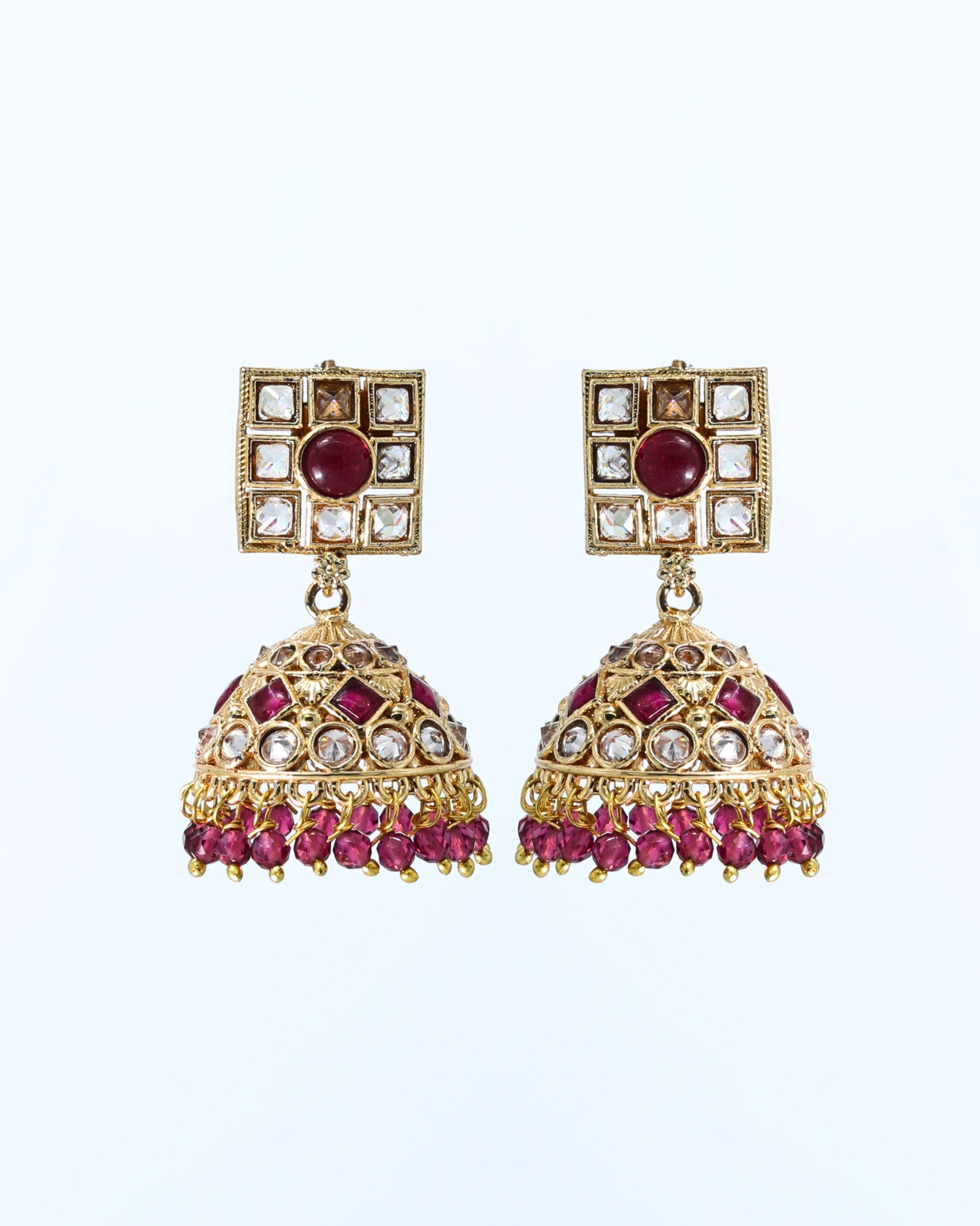 These earrings are identified as Red Polki Jhumka earrings. Jhumka earrings are a traditional style originating from the Indian subcontinent, known for their bell shape and intricate designs. These particular jhumkas feature a square-shaped stud adorned with a central ruby-colored stone surrounded by smaller clear stones, possibly polki diamonds, set in a gold-toned frame. The bell-shaped part of the earring is also embellished with ruby and clear stones, and the bottom edge is fringed with small ruby-colored beads. The earrings are designed with a gold-toned metal, enhancing their traditional aesthetic and making them suitable for cultural events or as a statement accessory.