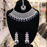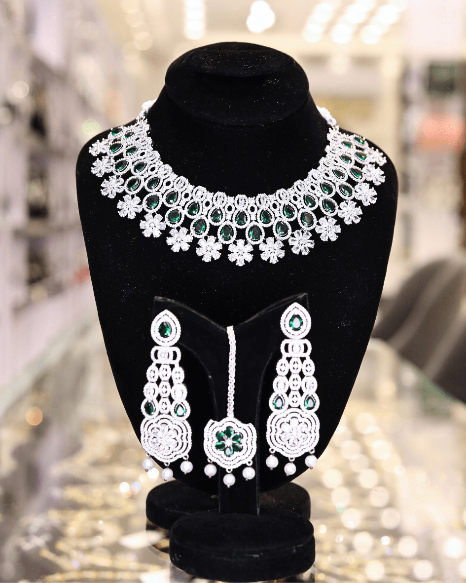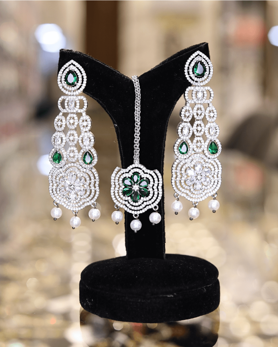 This jewelry set features an American Diamond necklace adorned with alternating clear and emerald-colored stones, complemented by matching earrings and a tikka. The necklace showcases a floral design with clear stones forming the petals and emerald stones at the center, connected in a scalloped pattern. The earrings mirror this design, featuring cascading clear stones and emerald accents, while the tikka presents a similar floral motif with dangling pearl-like beads.Making it a striking accessory for special occasions.
