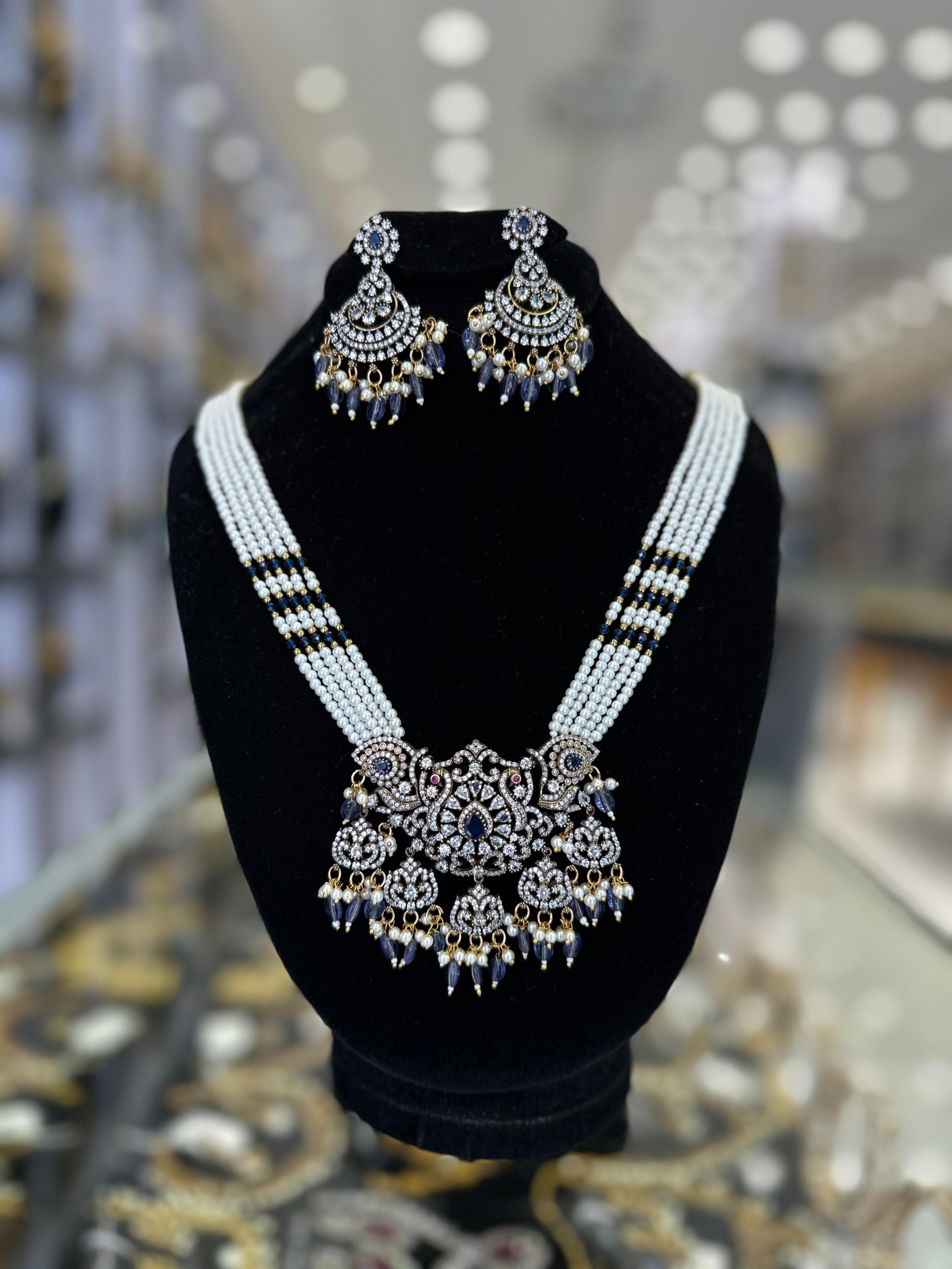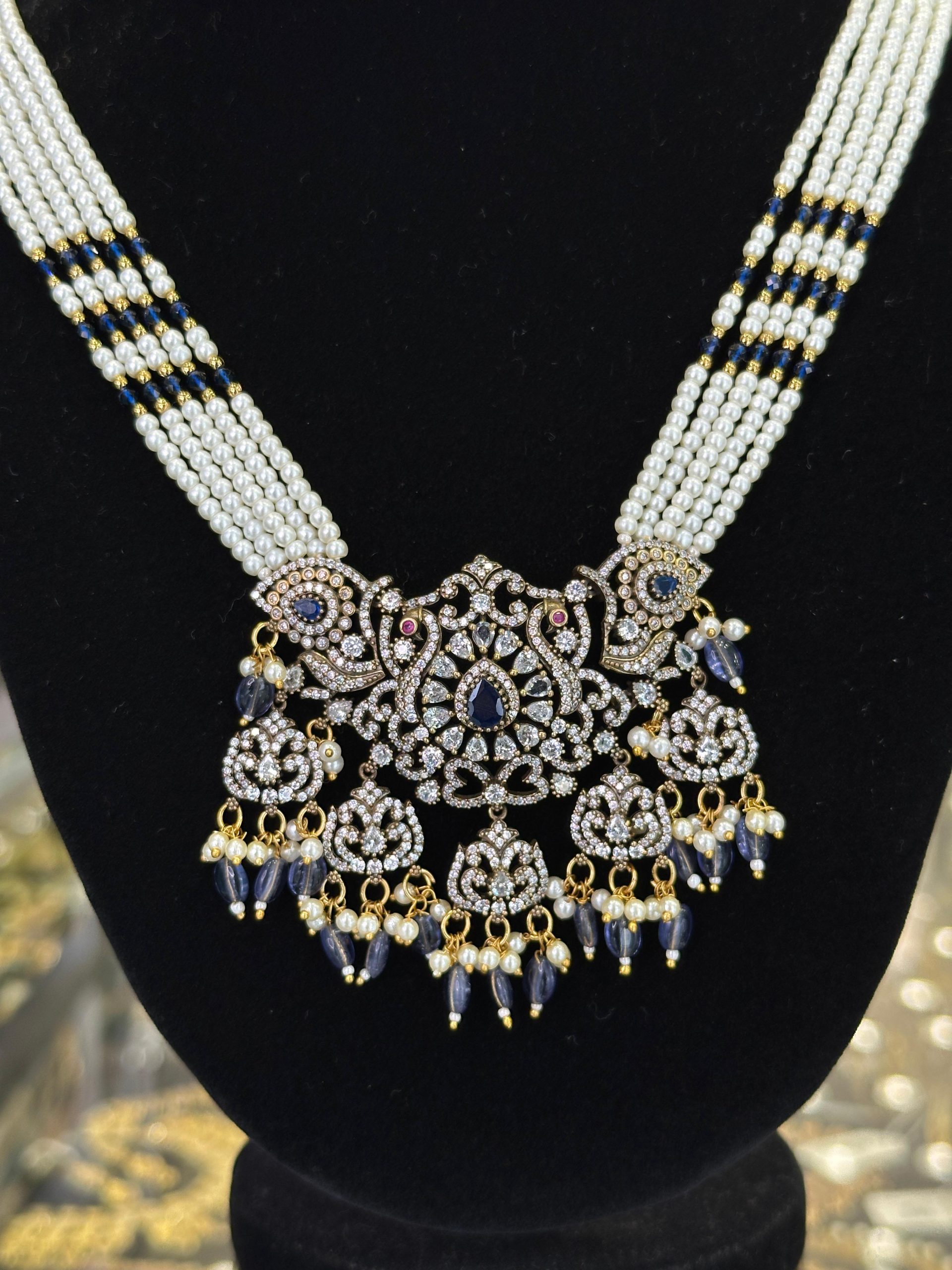 The combination of pearls, intricate metalwork, and deep blue stones creates a sophisticated and regal appearance, ideal for formal occasions or traditional attire.