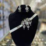 The exquisite jewelry set features a layered necklace and matching earrings, showcasing a blend of traditional elegance and intricate design.