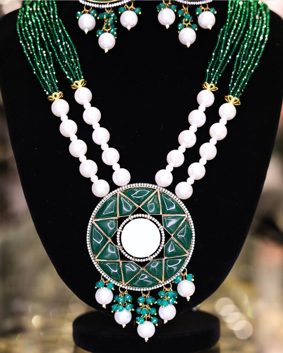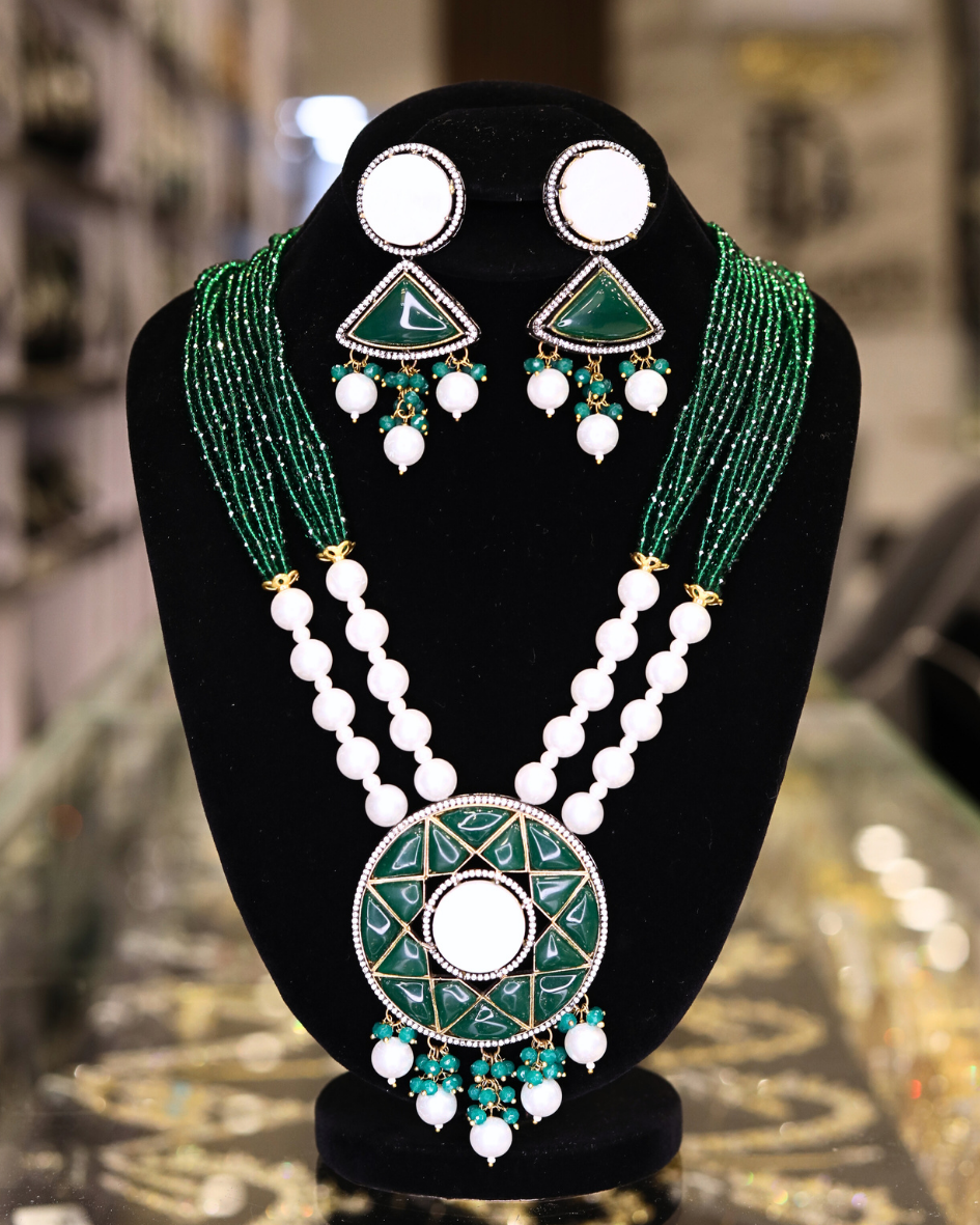 This jewelry set features a striking combination of green, white, and gold elements, showcasing a blend of traditional and contemporary design. The necklace is composed of multiple strands of small, vibrant green beads that create a layered effect, complemented by sections of larger, lustrous white pearls. The pendant is a circular design with a white center, surrounded by green triangular segments outlined in gold and encrusted with small, clear stones. Dangling from the pendant are additional small green and white beads, mirroring the design of the earrings. The earrings are triangular, with a similar green and gold design and dangling beads, completing the set. This jewelry set would be suitable for formal occasions, adding a touch of elegance and sophistication to any attire.