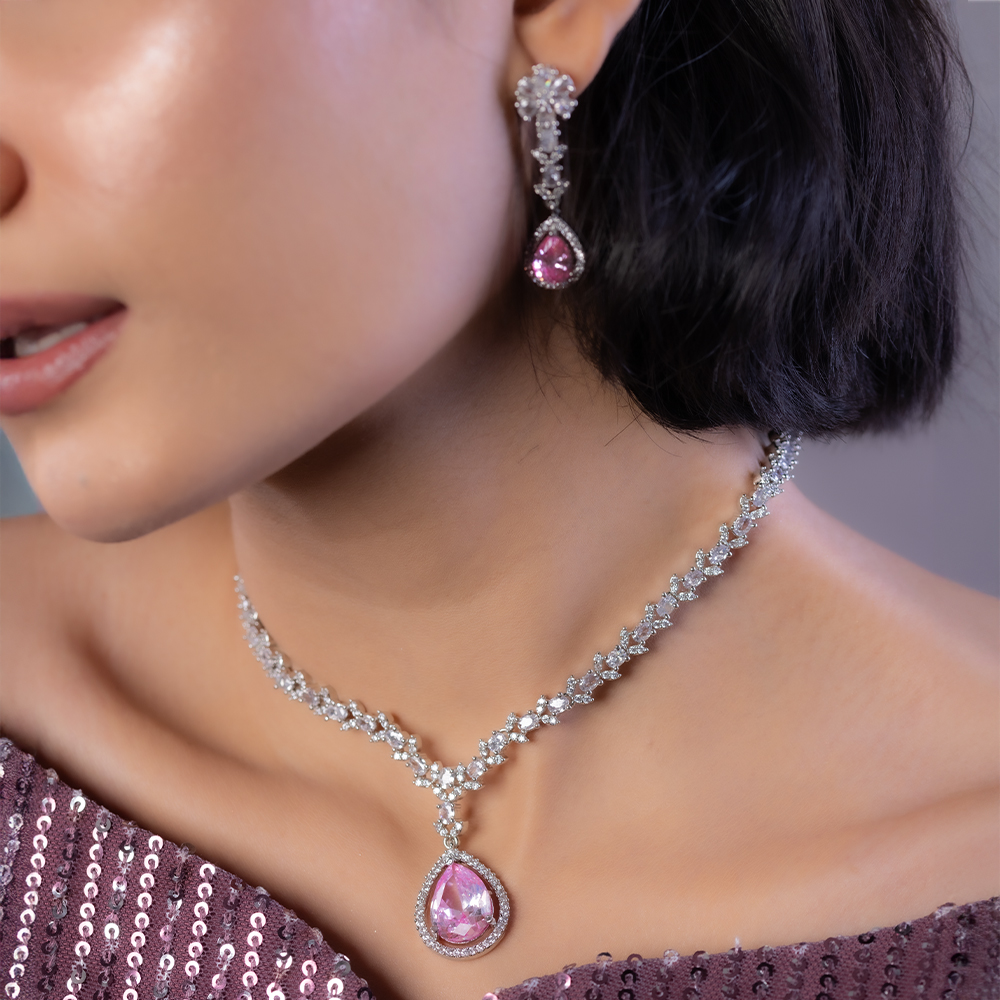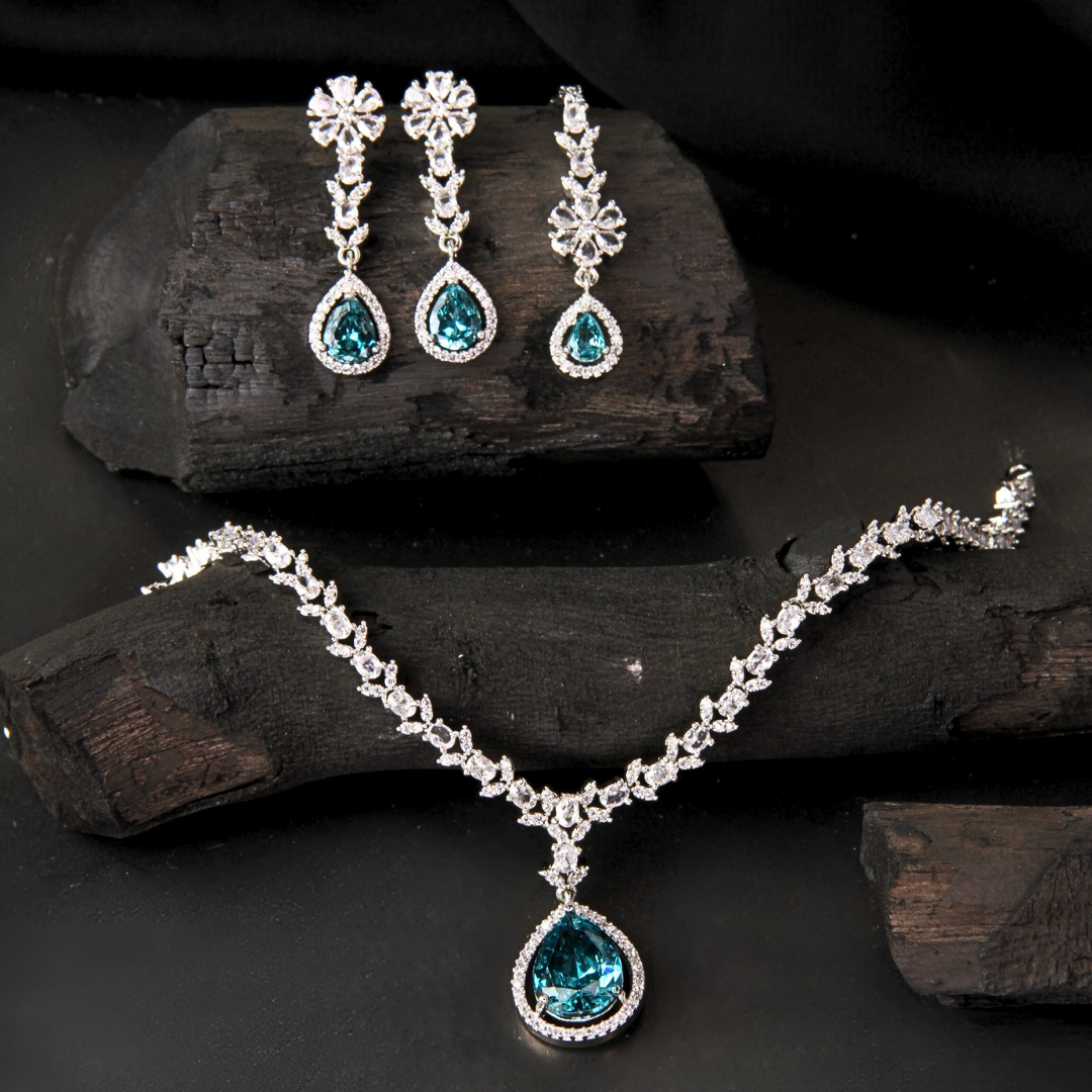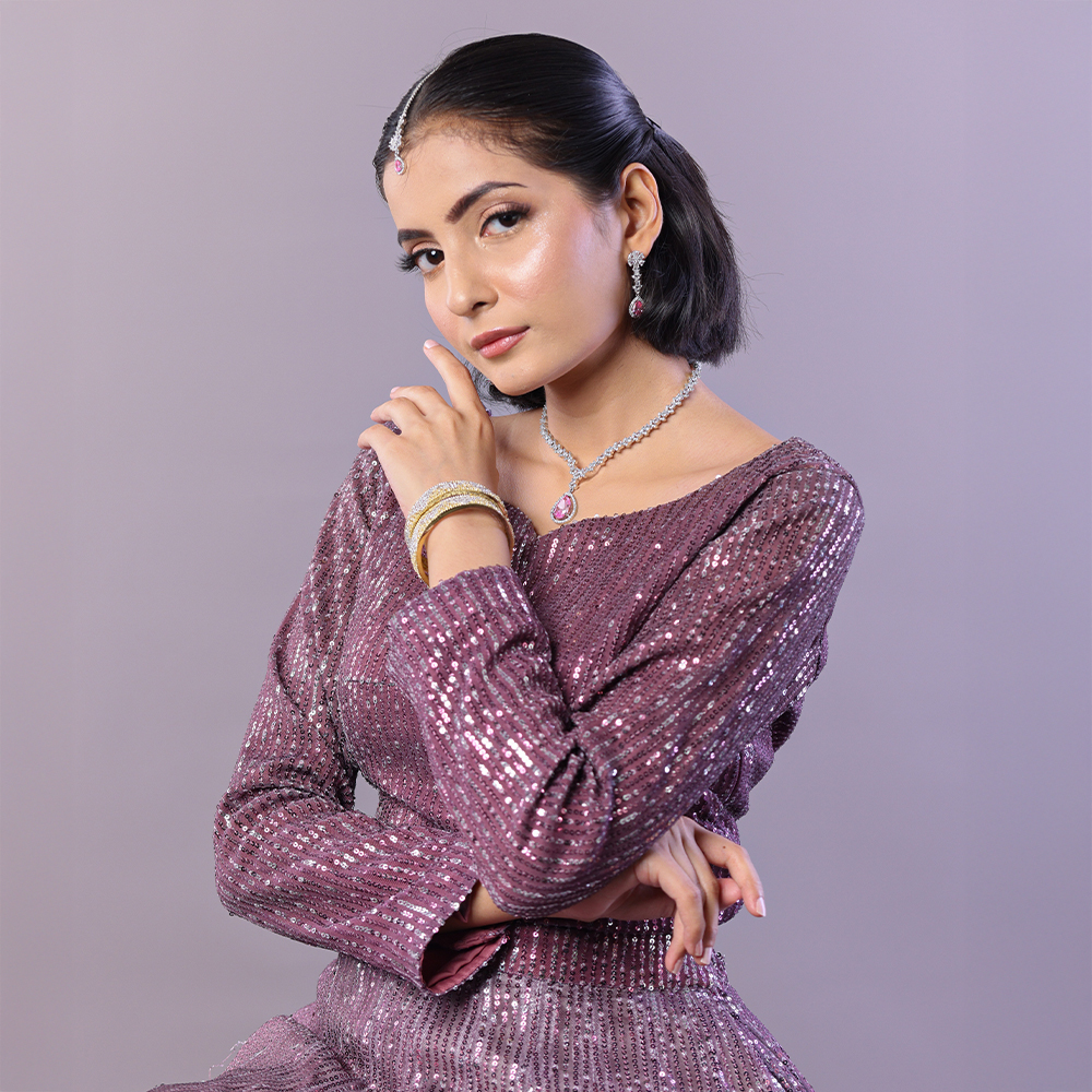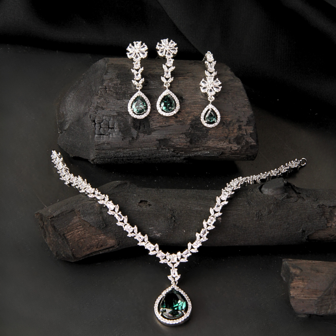 Add a touch of modern elegance to your collection with the Zircon Cubic Drop Set, featuring a drop-style necklace, matching earrings, and a maang tikka. This set is a perfect choice for evening gatherings or as an eye-catching wedding guest accessory.
