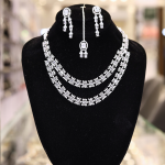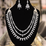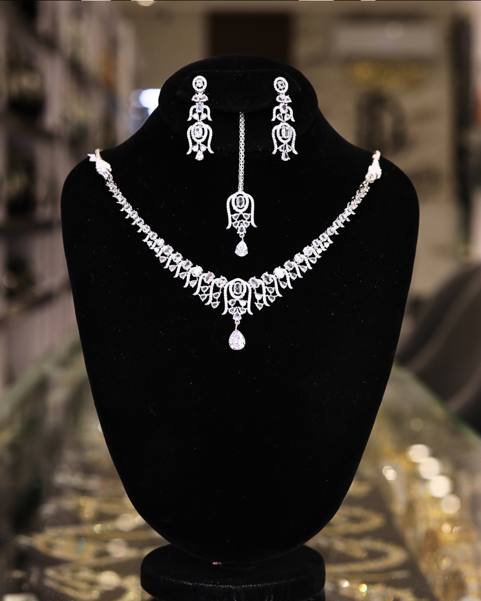 This Diamond Necklace Set presents a symphony of sparkle and sophistication. The necklace, earrings, and tikka (headpiece) are meticulously crafted, featuring intricately set, shimmering American diamonds that capture and reflect light with every movement. The design exudes elegance, with delicate patterns and a central pendant on the necklace, complemented by matching earrings and a tikka, perfect for adding a touch of glamour to any special occasion.