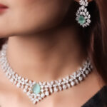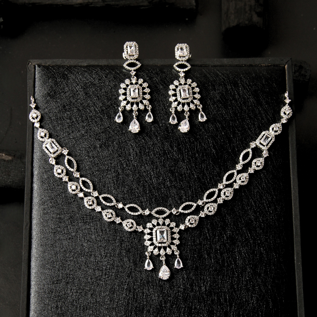 Keep it classy with the Two-Line Cubic Zircon Set, featuring a sleek and sophisticated double-line necklace. This versatile set is perfect for dawats, daily gatherings, or as wedding guest jewelry, offering elegance and affordability in one.