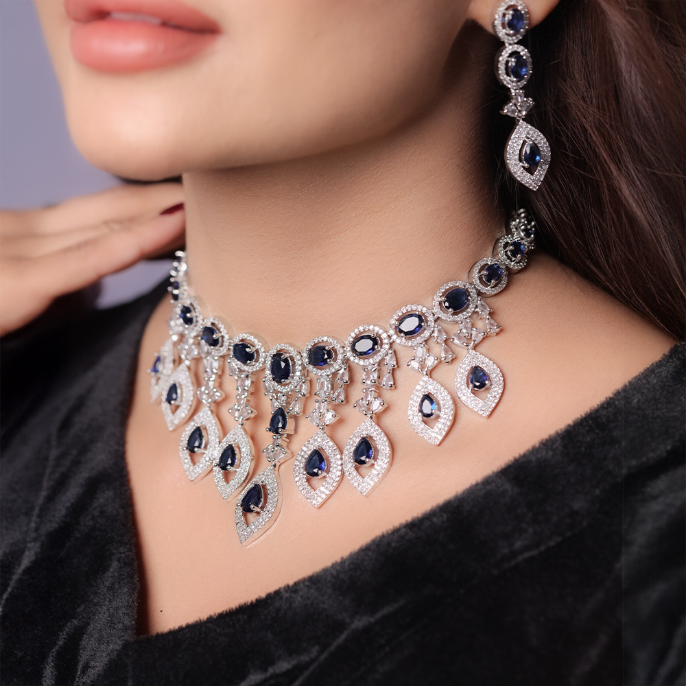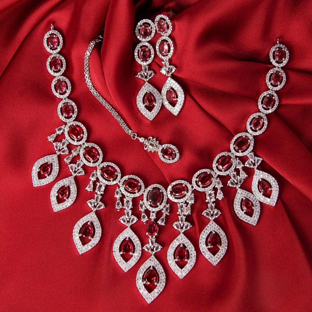Make a statement with the Zircon Glimmer Set, a beautiful combination of a sparkling necklace, earrings, and a maang tikka. This set is designed for those who love zircon party wear jewelry that’s ideal for gatherings, parties or wedding ceremonies.